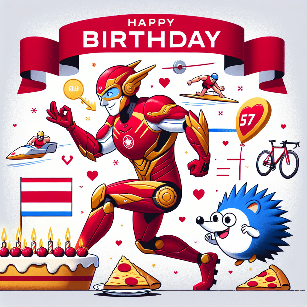 The image depicts a light-hearted birthday setting, infused with a heroic touch of a red-and-gold armored superhero striking a fun pose, embodying characteristics of a technical wizard and tenacious heart. To reinforce the triathlon theme, symbolic icons for swimming, cycling, and running are present, overlaid with the national colors of Austria: red and white. There is an anthropomorphic blue hedgehog zooming through the scene, leaving a trail from the piece of pizza he's mischievously grabbed, adding an eccentric twist to the gathering. The entire picture unifies as a playful tribute to the diverse hobbies of the birthday individual.