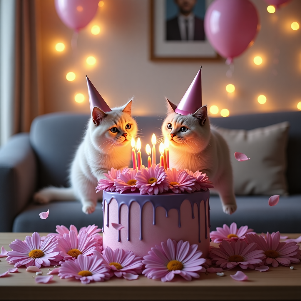 A humorous and ultra-realistic birthday scene set in a cozy living room: a decadent, slightly lopsided pink and purple birthday cake topped with lit candles is humorously overrun by daisy and rose flowers that look like they're rebelliously growing out of the cake, petals everywhere. Balloons in pastel pinks and purples float and bop around wildly — one tangled in a confused housecat wearing a party hat. A daisy and a rose appear to be having a "balloon sword" duel on the cake. The overall lighting is soft and celebratory, with golden birthday lights in the background adding sparkle. Confetti is mid-air as if just thrown, and a subtle sense of chaotic festivity fills the room.