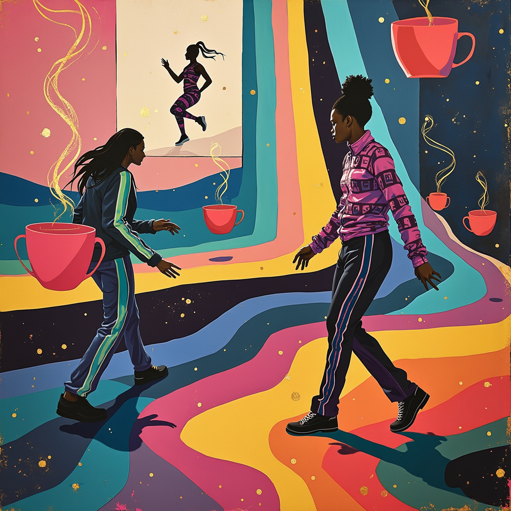 To one side, an activewear-clad figure, their form echoing the gestural brushstrokes of de Kooning, appears mid-dance. This figure wears a vibrant tracksuit covered in Pollock-like splatters of neon pink, yellow, and green paint. They are energetically moving to an unseen rhythm, an ode to Beyonce’s dynamic presence. Near them, a second figure stands tall and strong, symbolizing feminism, their stance powerful and confident, outlined in a bold, singular line like Malevich's works.