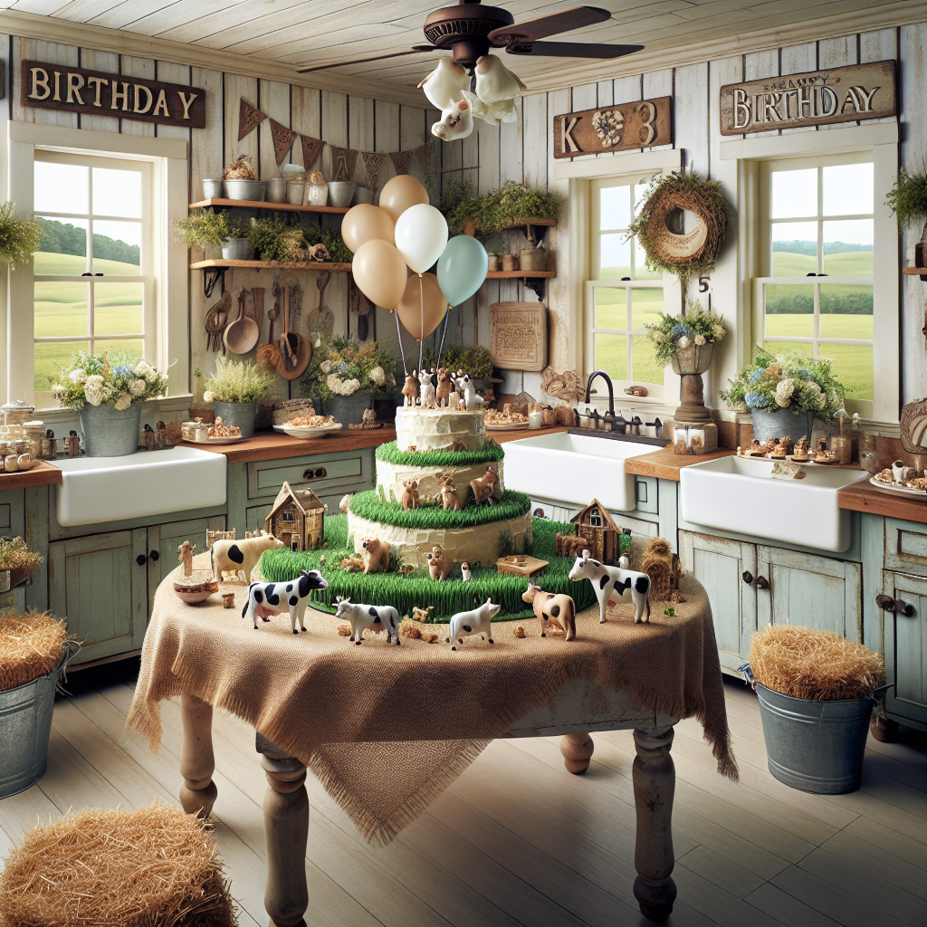 Create a charming birthday tableau set within a rural farmhouse kitchen. Visualize a kitchen table covered with a burlap runner, and decorated with miniature hay bales and porcelain cows. The centerpiece is a cake with icing that mimics lush grass, topped with edible farm animals made from fondant. In various corners of the room, incorporate rustic wooden signs bearing lively birthday messages and clusters of balloons in hues inspired by the earth. Accompany each window with buckets filled with fresh wildflowers, infusing the space with a realistic and pastoral ambiance.