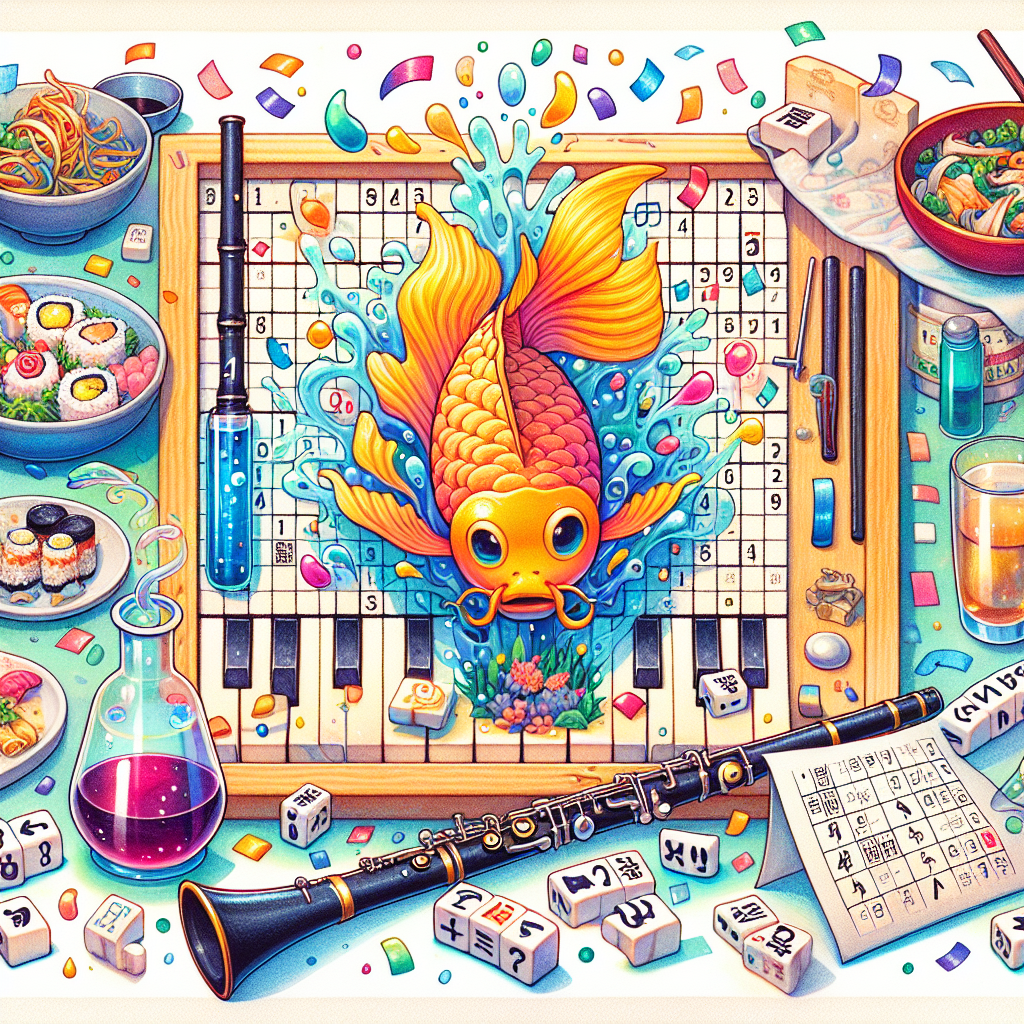 Create a whimsical birthday illustration featuring a vibrant scene. A cute fish, similar to a carp but enhanced with fantastical elements, splashes amidst the scenery. It appears to float above a confetti-scattered grid resembling a Sudoku board. Meanwhile, a clarinet lies horizontally along the bottom, introducing a touch of music to the setting. Culinary elements frame the scene, with sushi and traditional Korean dishes capturing attention. A glass of wine and a steaming cup of coffee sit off on the periphery. Pieces of chemistry lab equipment are arranged sporadically, each filled with bubbling, colorful liquids. The vapors from these vessels morph playfully into musical symbols. Scattered throughout the scene are Mahjong tiles, adding an element of traditional gaming. Amid all these details, snippets of fictional concert posters add the final touch, peeking from the corners.