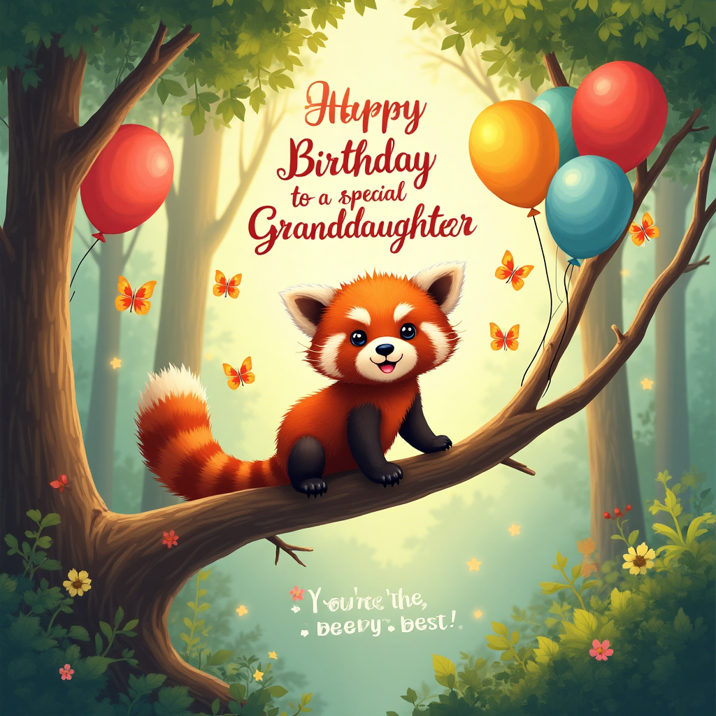 Picture a delightful scene in a whimsical forest, where a charming red panda is the star of the show. The red panda is joyfully balanced on a branch, surrounded by fluttering butterflies and colorful balloons tied to the branch. The background is a lush, enchanting forest with soft, dappled sunlight filtering through the leaves. Below the red panda, nestled in the leaves, is a small, cheeky caption: "You're the 'beary' best!". The color palette is warm and inviting, featuring shades of reds, greens, and a touch of gold to accentuate the magic of the moment.