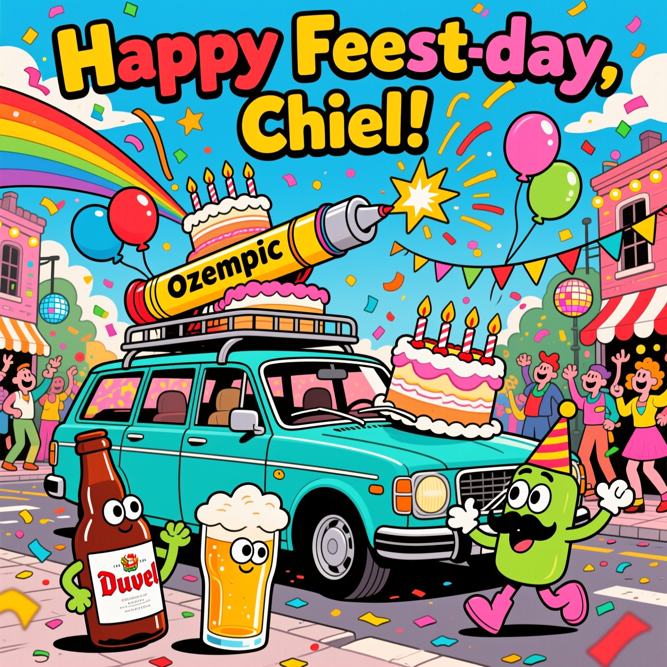 A big, bright, funny cartoon scene: a classic boxy Volvo station wagon in vibrant teal, parked at a jaunty angle in the middle of a lively street feest. The roof rack carries a gigantic Ozempic pen–shaped party blower turned into a confetti cannon, blasting rainbow streamers and balloons into the sky. A towering birthday cake wobbles on the hood, candles flickering, with motion lines and starbursts for extra oomph. In the foreground, a cheerful Duvel-style tulip beer glass and bottle are anthropomorphized with googly eyes, tiny party hats, and a foamy moustache, dancing and clinking with comic bounce. Around them: bunting and disco lights, confetti swirls, and guests in whimsical, energetic poses.
