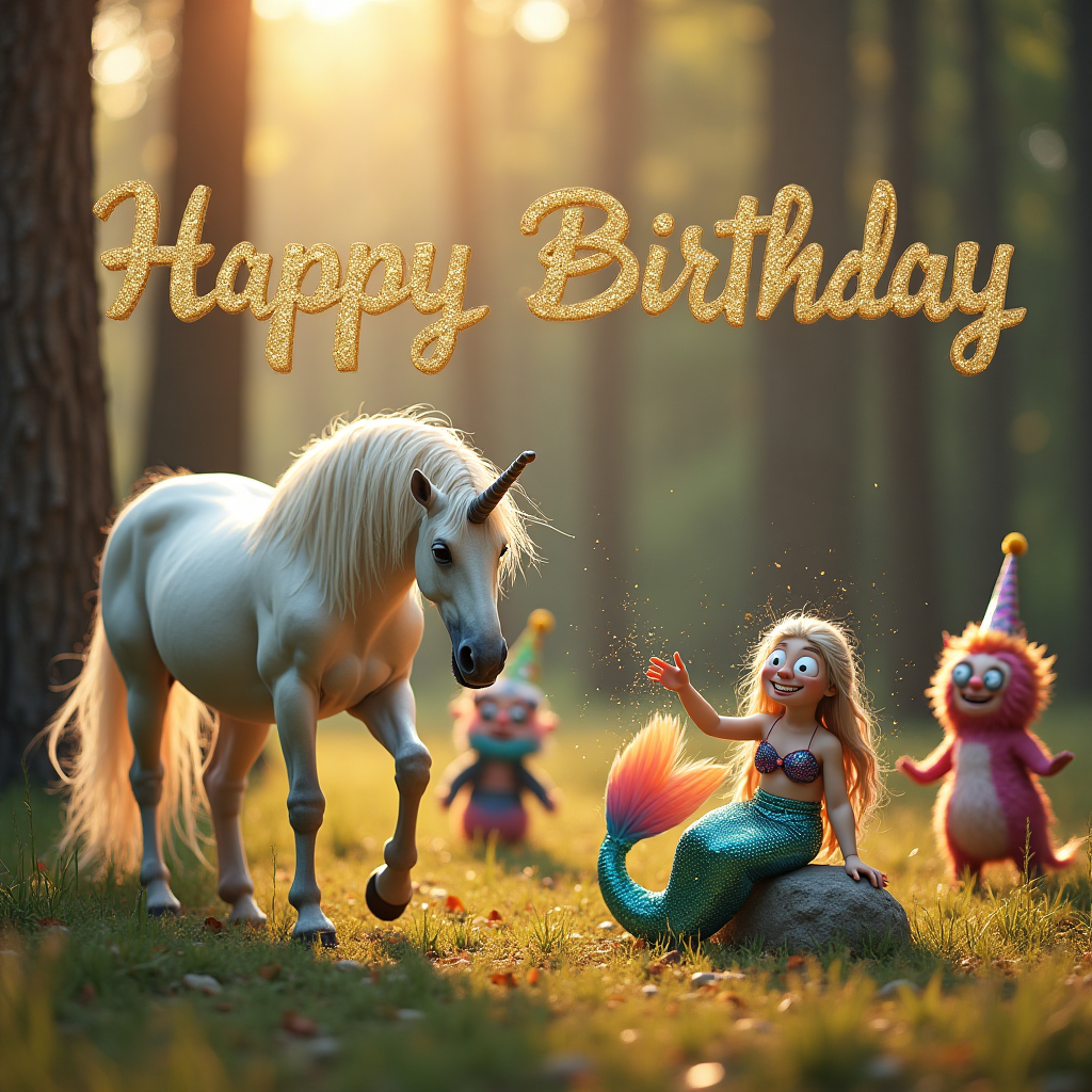 The scene unfolds in a whimsical forest clearing bathed in the golden glow of the afternoon sun. In the foreground, a majestic unicorn with a shimmering, iridescent mane grazes serenely, its large, expressive googly eyes full of life and curiosity. Beside it, a playful mermaid with a dazzling, glittering tail sits perched on a rock, her long hair cascading in soft waves down her back, her eyes wide with delight as she tosses a handful of glitter into the air.