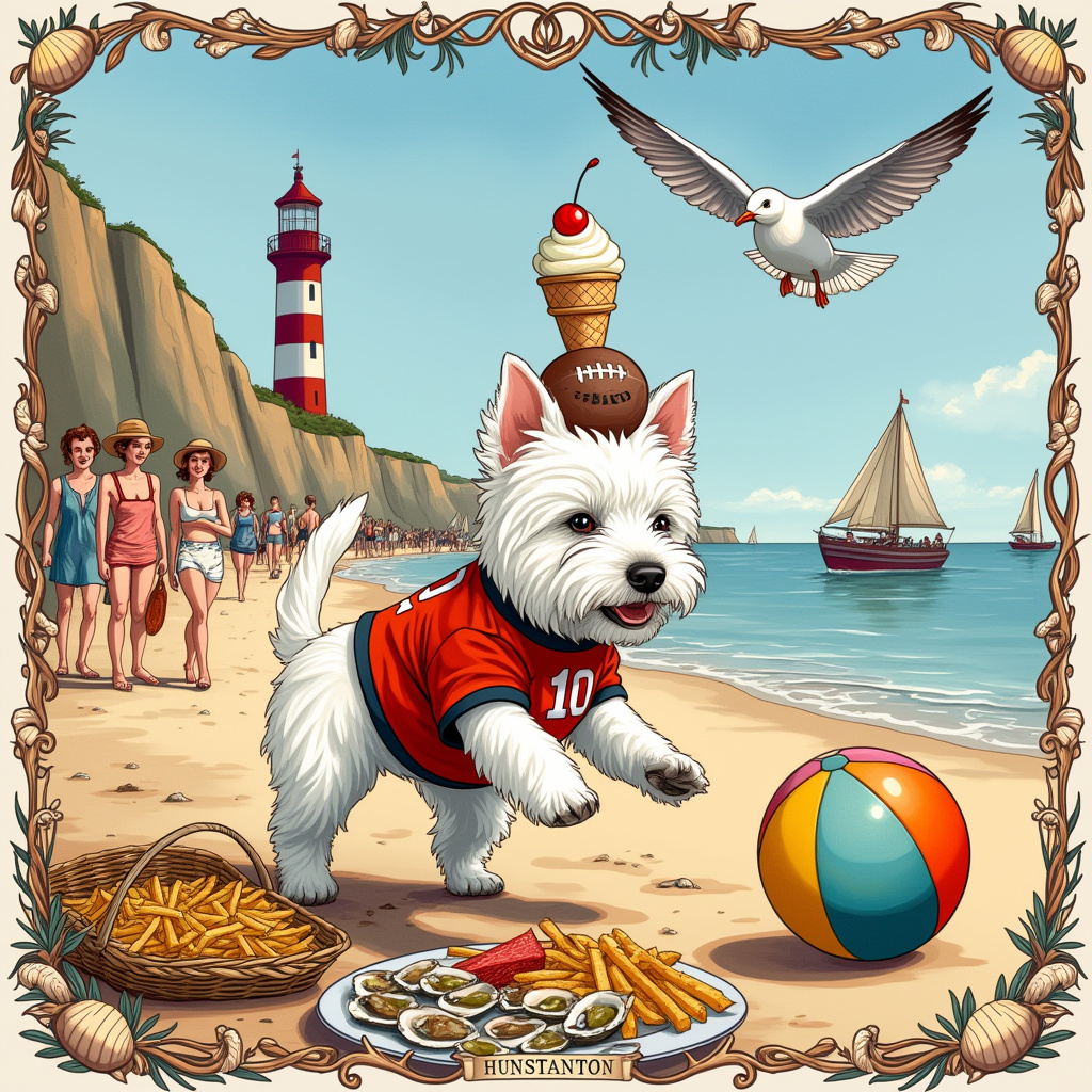 In this whimsical birthday illustration, picture a bustling beachside setting at Hunstanton, complete with its iconic striped cliffs and a vintage Victorian lighthouse towering in the background. In the foreground, a charming little white dog, resembling a fluffy West Highland Terrier, is hilariously clad in a tiny football jersey, with a number 10 on its back, and a mini football at its paws. The terrier is mid-action, appearing to expertly dribble the ball with its nose, as if attempting a goal on the sandy shore. Surrounding this athletic pooch is a comical array of food items: a seafood picnic spread, including a basket spilling over with fish and chips, a platter of gleaming oysters, and a towering ice cream cone precariously balancing on the terrier’s head like a hat. Nearby, a beach ball in bright, cheerful colors has rolled to a stop beside a group of amused beach-goers dressed in Edwardian swimwear, reminiscent of Beatrix Potter's genteel characters, laughing at the spectacle. In the distance, a seagull, inspired by Quentin Blake’s loose and lively linework, is swooping down with a curious eye on the ice cream, adding an element of impending chaos. The sky is a gradient of watercolor blues and purples, suggesting a late afternoon sun beginning its descent. The entire scene is framed by an elaborate Aubrey Beardsley-esque border of intricate seaweed and shells, offering a nod to the Victorian seaside resort's history, while echoing the playful elegance of Edward Gorey's style. This eclectic mix of elements creates a story that is both humorous and enchanting, capturing the joy and surprise of a birthday at the beach.