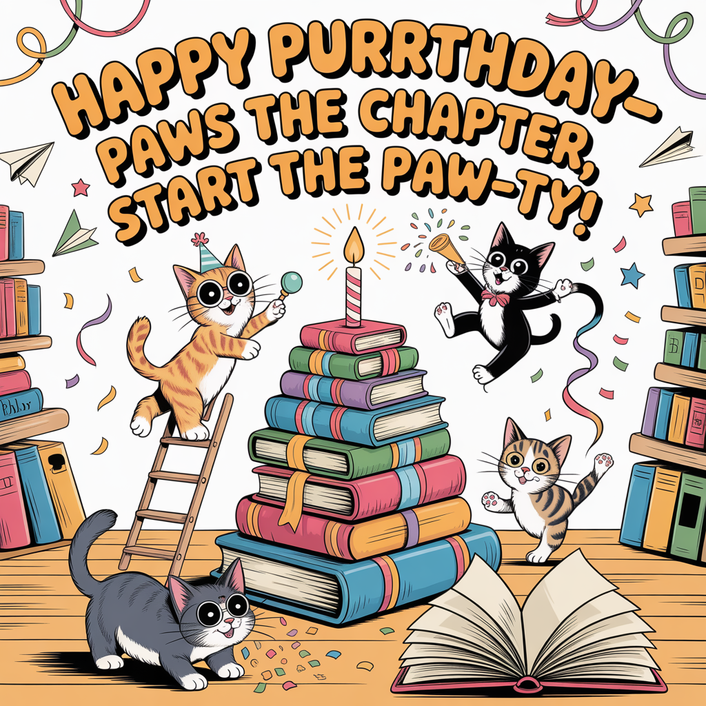 Create a playful cartoon scene: center a towering, tiered “book cake” built from stacked, brightly colored hardcovers; ribbon bookmarks drape like frosting, and a glowing quill-shaped candle crowns the top. Around it, zany cartoon cats with exaggerated proportions (big heads, expressive eyes, tiny paws) in energetic poses: a bespectacled orange tabby wobbling on a step ladder to blow the candle; a tuxedo cat mid-leap with a party horn bursting confetti; a chonky gray cat belly-up on an open book, swishing its tail through glittery confetti; a calico kitten peeking out from between book pages like curtains. Background: whimsical library shelves leaning at fun angles, streamers made from bookmarks, floating paper planes, colorful fish-shaped and star confetti swirling. Style: thick outlines, bold cel-shading, bright saturated colors (teal, sunshine yellow, hot pink, tangerine, violet), playful motion lines and starbursts, warm candle glow highlights. Important: include no other readable text anywhere—let the single headline steal the show.