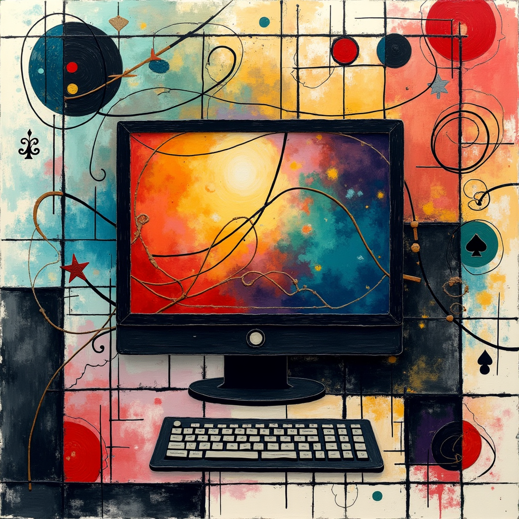 Begin with a textured, chaotic Pollock-style background featuring splatters and streaks of vibrant colors like electric blue, neon green, fiery red, and deep purple. Over this, incorporate a grid of Mondrian-inspired lines, using bold blacks and whites, but allow them to intersect in a more fluid, less rigid manner, echoing the interconnectedness of computers and networks.