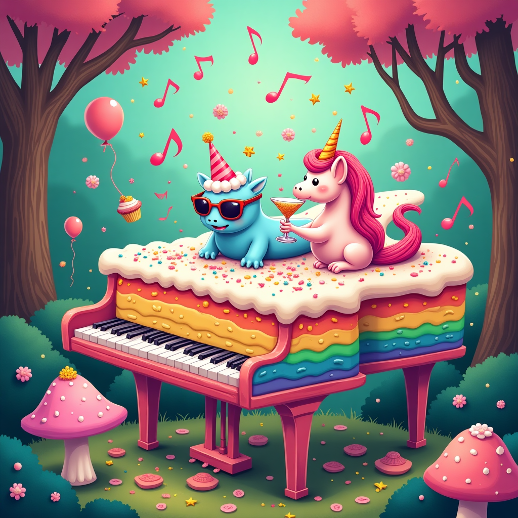 Create a vibrant, whimsical cartoon-style illustration set in an enchanted forest party scene. In the center, an adorable axolotl with party sunglasses is dramatically playing a grand piano made entirely of rainbow-frosted birthday cake. Sprinkles fly as musical notes float into the air. A fabulous, sparkly unicorn wearing a party hat is lounging atop the piano, sipping glittery punch from a martini glass and humming along. Balloons shaped like cupcakes and musical notes drift above, while confetti and streamers explode from every corner. In the background, trees have icing-covered branches, and a dancing cake slice is photobombing from behind a mushroom. Make it cheeky, over-the-top fun, and filled with quirky magical energy!