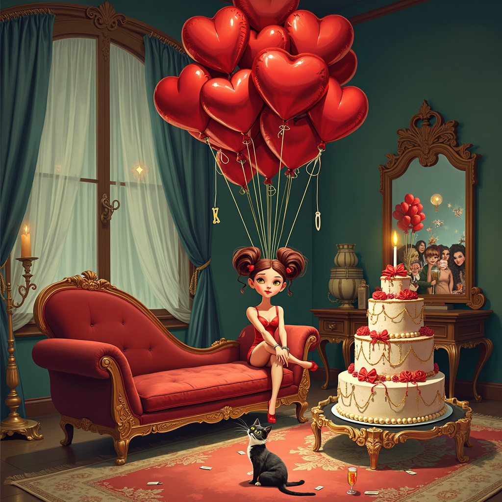 In a whimsical and flirtatious twist on a classic Norman Rockwell-esque birthday party, the scene unfolds in a cozy, dimly lit living room, adorned with an eclectic mix of vintage and modern decor. A plush red velvet chaise longue sits prominently in the center, reminiscent of Maxfield Parrish's opulent settings, adorned with gold tassels and intricate embroidery. The birthday celebrant, a playful caricature styled in a Beatrix Potter meets Quentin Blake fashion, is dressed in a cheeky, flirtatious red outfit with a mischievous glint in their eye.
