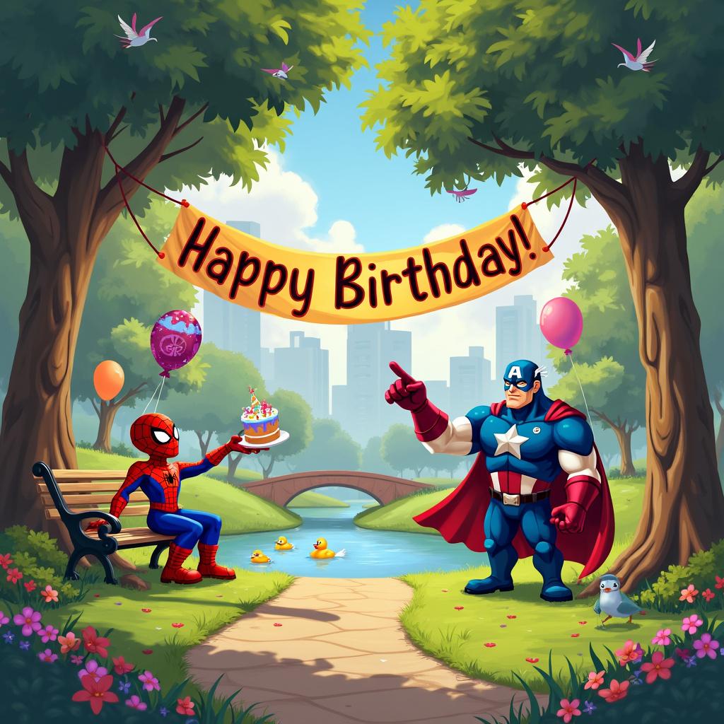 **Summary**: This playful birthday scene in a park showcases beloved Marvel superheroes enjoying games and festivities, creating a delightful atmosphere filled with laughter and fun.