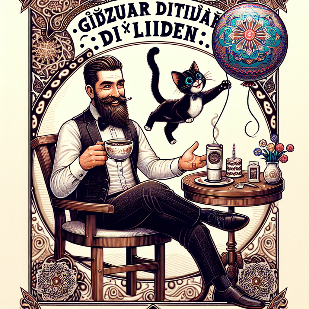 Create an illustration portraying a charming birthday scene. The scene is composed of an Albanian man with a thick beard and a heartwarming smile. He is seated comfortably at a small cafe table, lifting a coffee cup with one hand and delicately holding a cigarette with the other. A tuxedo cat with lively eyes and a bushy tail is depicted playfully leaping towards a vibrant, festive balloon. Intricate Albanian patterns enrich the scene, and the stylishly arranged phrase 'Gëzuar ditëlindjen' and forms an attractive frame around the composition, adding a celebratory sentiment to the whole display.