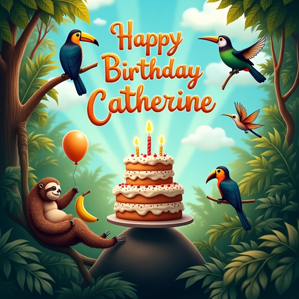 In this whimsical birthday scene, set in a lush Costa Rican jungle, a delightful tableau of animals unfolds. The foreground features a sleepy sloth lounging contentedly on a low-hanging tree branch, its fur mottled with greens and browns to blend seamlessly with the foliage. Hanging next to it, a mischievous monkey with a cheeky grin is holding a birthday balloon shaped like a banana. Above them, a vibrant toucan with a multicolored beak perches on a branch, its feathers a symphony of blues, oranges, and yellows. Nearby, a delicate hummingbird, with iridescent plumage shimmering in shades of emerald and sapphire, hovers effortlessly, its wings a blur. The jungle's dense background is a tapestry of emerald greens and shadowy depths, with beams of sunlight streaming through the canopy to spotlight this festive gathering. In the center, there's a giant birthday cake balanced precariously on a flat rock, with layers in the colors of a Costa Rican sunset. Intricately frosted letters spell out "Happy Birthday Catherine" in the sky above, with the words forming from fluffy white clouds gently drifting in a brilliant azure sky. This enchanting scene, rich in detail and charm, invites the viewer to celebrate with a sense of wonder and joy.