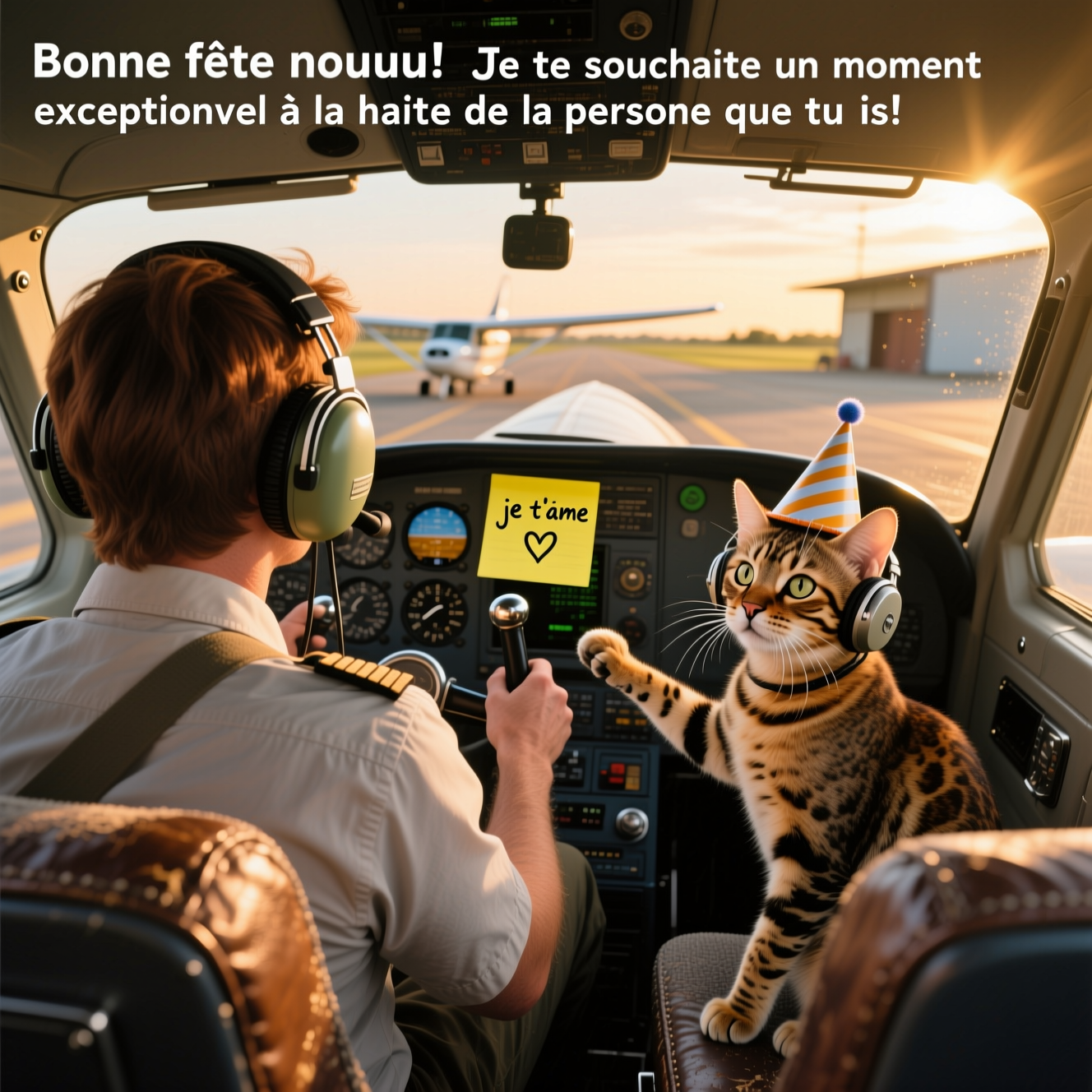 Generated with these themes: Pilote d’avion châtain de dos, Cessna 172, Post-it écrit: je t’aime ❤️❤️, Bengal, and .