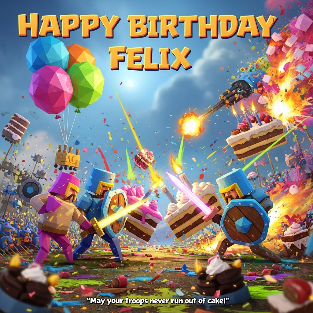 Create an abstract, funny birthday scene inspired by **Clash of Clans**, where geometric warriors made of triangles, circles, and jagged brushstrokes clash on a surreal battlefield made of layered confetti explosions and birthday cake fragments. Use exaggerated proportions: giant polygonal balloons floating like siege machines, cake-slice shields, and candle-swords glowing like neon spears. Swirls of vivid colors (hot pink, electric blue, lime green, and gold) crash together like armies colliding, with chaotic splashes of paint representing fireballs and frosting catapults.