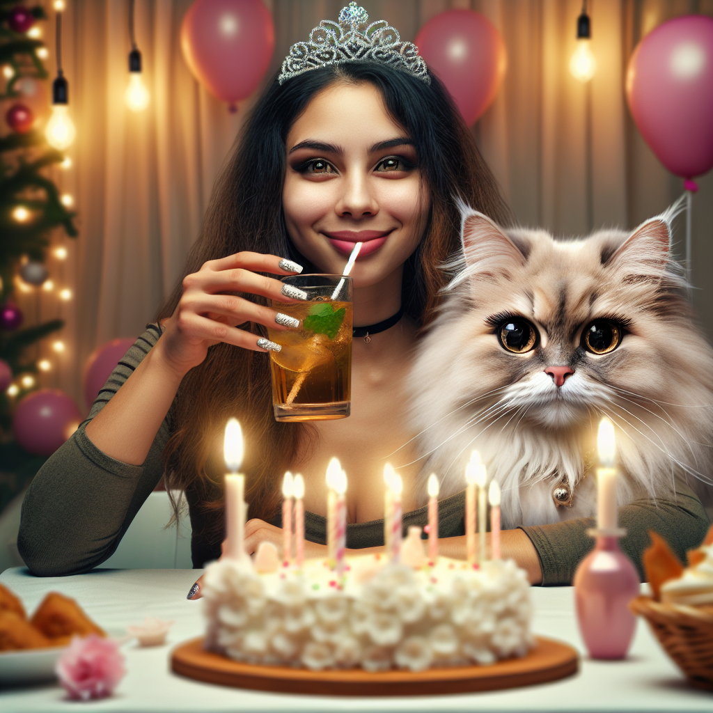 Create a charming and absurd image of a realistic birthday party setting. The birthday girl, a Hispanic teenager with twinkling eyes of happiness, sips a drink casually, surrounded by an inviting and warm set of birthday decorations. In the middle of this scene, imagine a Ragdoll cat that captivates everyone's attention, uniquely adorned with refined makeup and nail polish, providing a charming peculiarity to the celebration. This scene is filled with subtle sounds of clinking glasses and gentle murmurings of well-wishes.