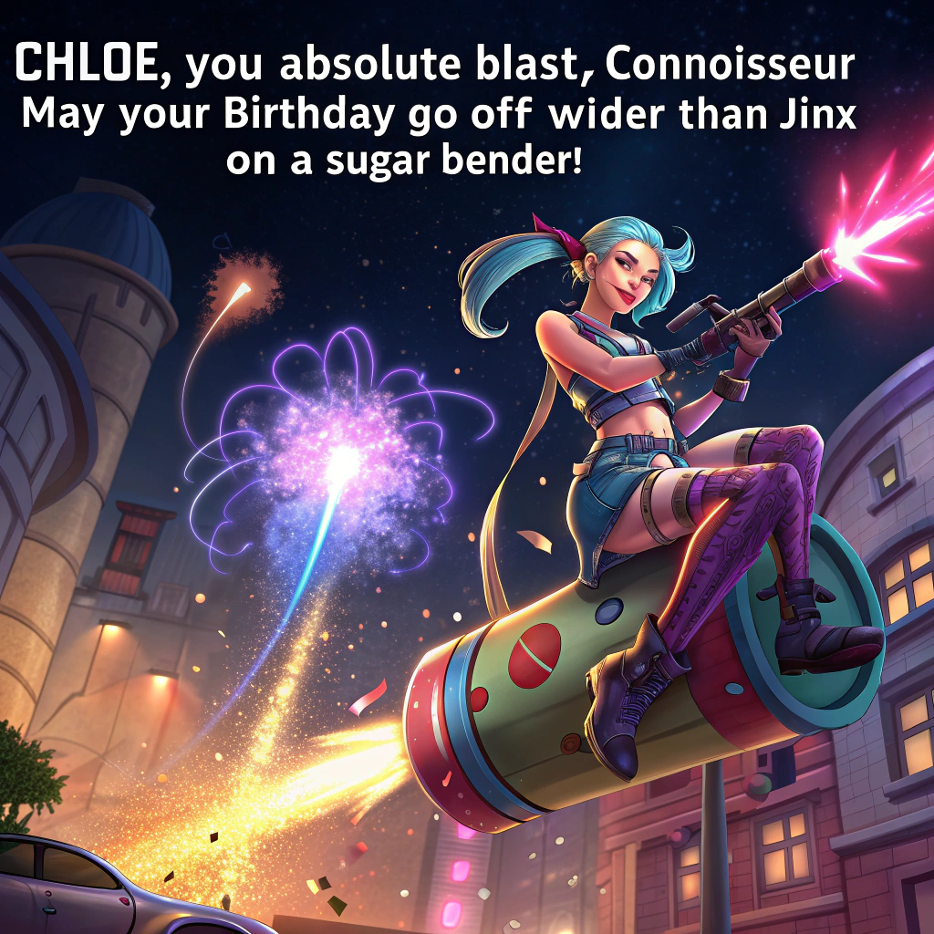 At the top of the image, "Chloe, you absolute blast-connoisseur – may your birthday go off wilder than Jinx on a sugar bender!"