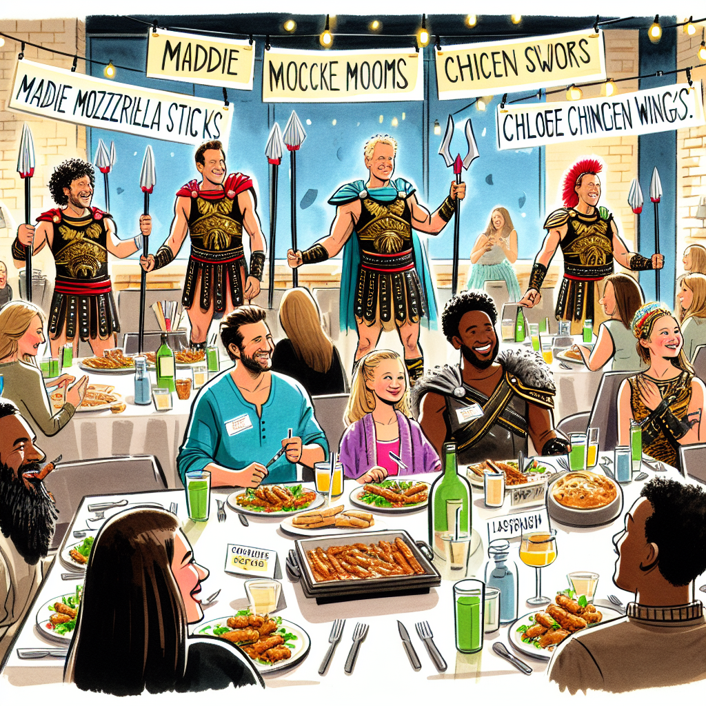 Create an illustration of a birthday party held in a restaurant. Themed around the popular TV show 'Dance Moms', each table is creatively decorated with items synonymous with the show. Guests can be seen enjoying 'Maddie Mozzarella Sticks' and 'Chloe Chicken Wings'. The server staff, adorned in modern-day gladiator outfits with foam swords, keeping the celebratory spirit alive. Amid the laughter and festivities, the background music of the latest hits transforms the dining area into a makeshift dance floor.