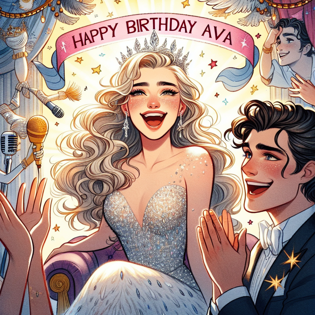 The illustrated scene unfolds with a radiant youthful woman, who appears in her late teens and boasting flowing blonde hair. She, glowing with happiness, is adorned in a sparkling stage costume and sings enthusiastically amidst larger-than-life, playful theatrical props. A 'Happy Birthday Ava' banner floats mirthfully above, adding to the celebratory ambiance. To one side, there's a charmingly animated young man with wavy hair, showing off his unmistakable stage presence as he claps with fervor, lending an air of star-studded excitement to the birthday feast.