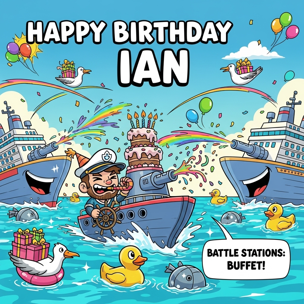 A bright, playful cartoon naval scene where enormous, smiling cruise ships wage a silly “party war” on a sparkling turquoise sea. Front and center, Captain Ian as a chibi hero with an oversized captain’s hat, party blower, and huge grin, steering the flagship as a towering birthday-cake turret launches confetti and frosting swirls. Opposing cruise ships “fire” rainbow water balloons, streamers arc across the sky, rubber-duck torpedoes bob and squeak as they splash, and seagulls in floaties swoop by carrying wrapped gifts. Everyone is joyful and energetic—no real weapons or harm, just goofy party mayhem.