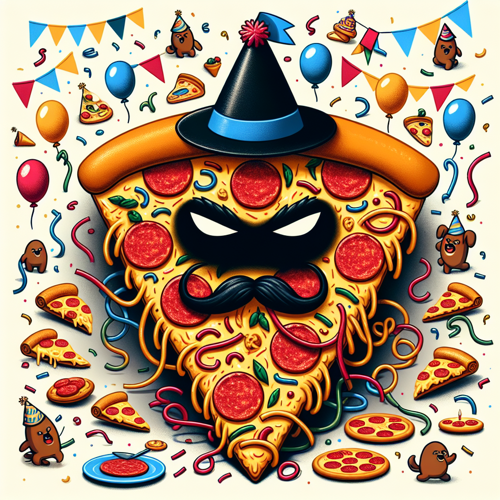Create a vibrant birthday scene with a whimsical element. The focus is on a hefty slice of pepperoni pizza wearing a festive hat, against which an enigmatic shadowy figure with a pair of distinguished, large helmet-like headgear resides, tangled with birthday streamers. The atmosphere is filled with playful food-related jokes and satisfied cartoon-like pets distributed across the image, each with a mini pizza slice or a birthday balloon in their grasp, adding fun and excitement to the design.