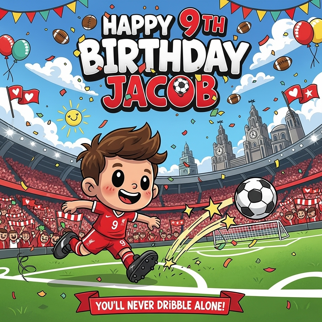 At the top of the Cartoon Style image, add the text "Happy 9th Birthday Jacob" in big bubbly Liverpool-red letters with a thick white outline and playful drop shadow, sprinkled with tiny football icons and red-and-white confetti.