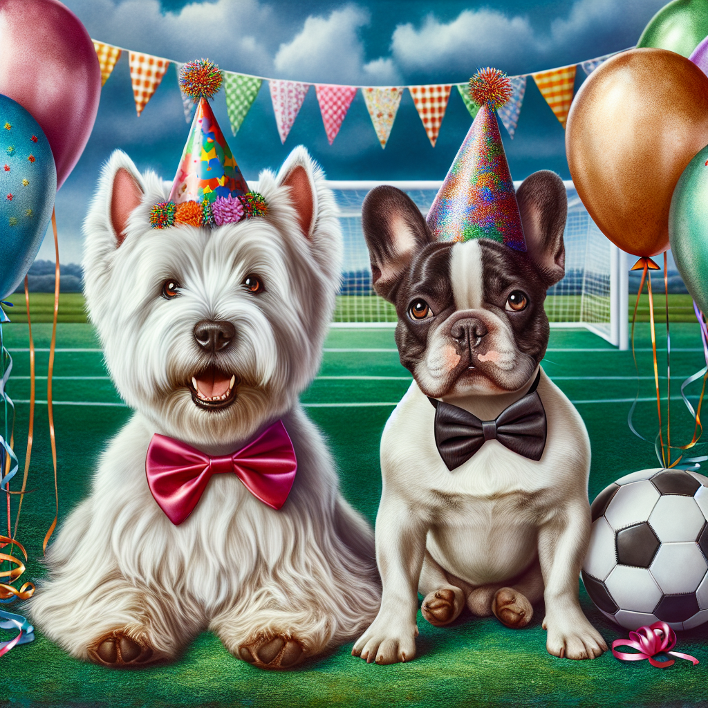 A jovial, birthday-themed artwork presenting a lighthearted, White West Highland Terrier donning a vibrant party hat, seated adjacent to a delightful French Bulldog embellished with a dressy bow tie. Both canines are encircled by festively ornamented balloons and a soccer ball at their forelegs. This scene is set against a backdrop featuring a verdant green field with a suggestion of a soccer goalpost far off. This creates a glimpse of playfulness tied with the festive theme.