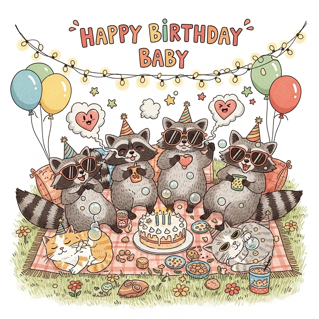 A whimsical hand-drawn illustration in warm, textured colors: a group of adorable raccoons and cats lounging together on a grassy picnic blanket under twinkling fairy lights, wearing tiny birthday hats and oversized sunglasses. Some raccoons are giggling as they lazily puff on little cartoonish smoke clouds shaped like hearts and stars, while the cats are curled up next to them with dreamy, half-lidded eyes, pawing at floating bubbles. A big, delicious birthday cake with rainbow frosting sits in the middle, surrounded by scattered flowers, party balloons, and snacks. The whole scene feels cozy, silly, and full of mischief, with fine linework and gentle brush strokes adding warmth and charm.