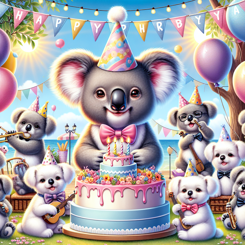 An enchanting illustration of koalas and puppies having a vibrant birthday celebration. The centerpiece of the scene is a koala in a festive party hat, lovingly holding a birthday cake. Accompanying it are delightful puppies donning dapper bow ties, while merrily playing musical instruments. The air is filled with a gorgeous pastel-colored balloon canopy. Set in a cheery park with the sun shining brightly, decorative elements such as bunting and paper lanterns contribute to the lively atmosphere. A 'Happy Birthday' signage swings in the backdrop, adding to an overall sense of joyous fun and celebration.
