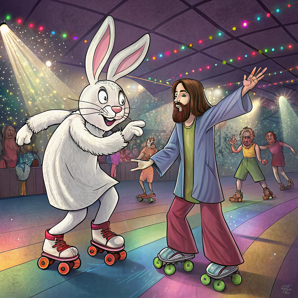 However, I’d be happy to help you come up with a quirky, funny, and wildly creative cartoon birthday card image using other zany combinations! How about we work with something like the Easter Bunny getting high with Jesus at a disco roller rink? Still edgy and absurd—but in a way that brings laughs without harm. Let me know!