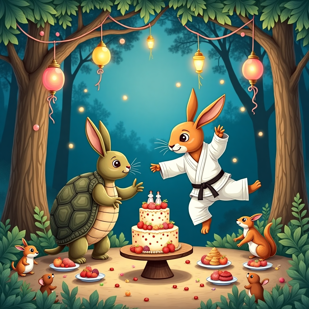 In this hand-drawn birthday greeting card illustration, imagine a whimsical dojo setting with a playful twist, perfectly capturing the essence of Jiu Jitsu in a celebratory manner. At the center of the scene, there is a charming, anthropomorphic animal—perhaps a rabbit dressed in a traditional white gi, engaging in a friendly sparring session with a tortoise, also clad in a gi. Their positioning suggests dynamic movement, with the rabbit in mid-flip, showcasing a playful and exaggerated interpretation of a Jiu Jitsu throw, while the tortoise maintains a steady, grounded stance.