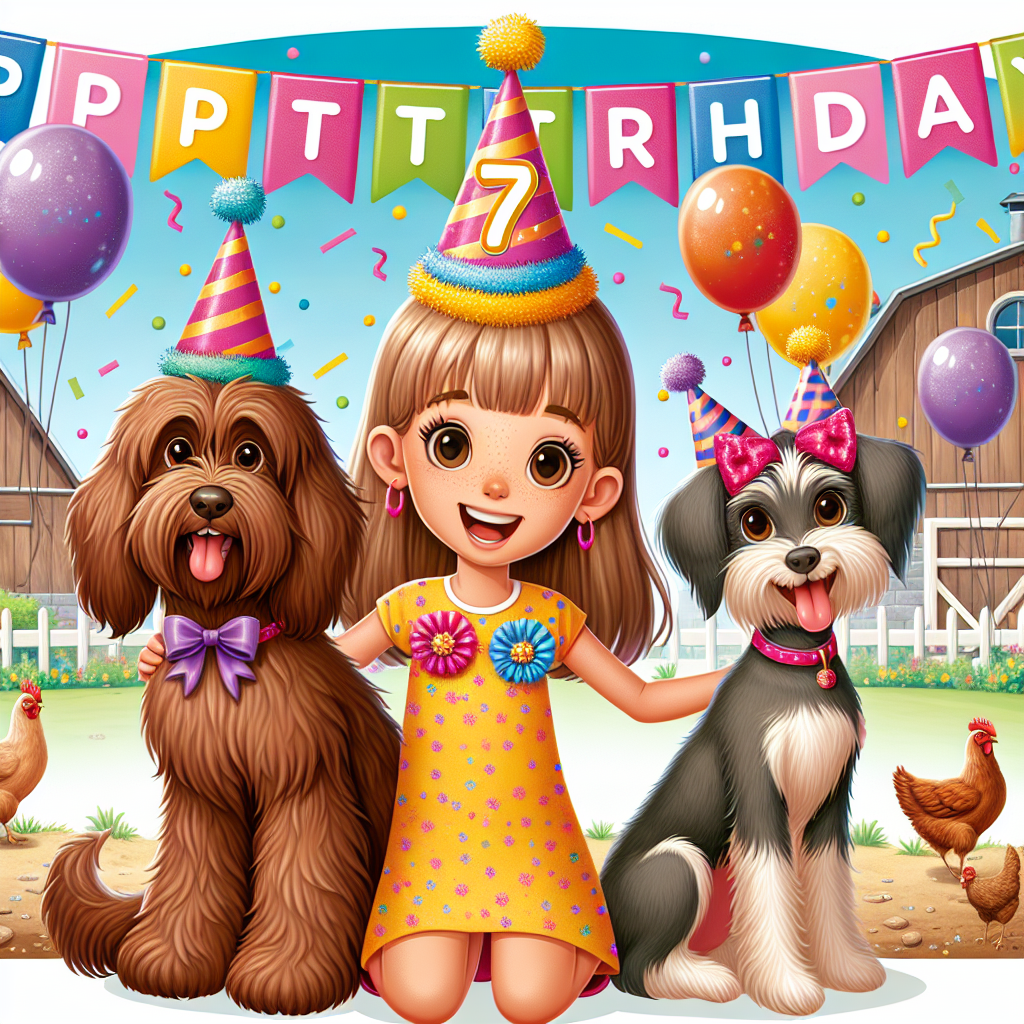 Create a bright and engaging birthday illustration: The center stage is taken by a delighted Caucasian girl, the birthday celebrant, who is seen wearing a cheerful party hat. She is encircled by her lovable pets, a shaggy brown cockapoo and a streamlined fawn-colored Italian greyhound, both of which have been dressed up with diminutive festive bows. The backdrop shows a barnyard scene where chickens are observed pecking in the vicinity of a 'Happy 7th Birthday' banner that's suspended between two towering trees, with vibrant balloons and colorful confetti adding a festive touch to the entire setting.