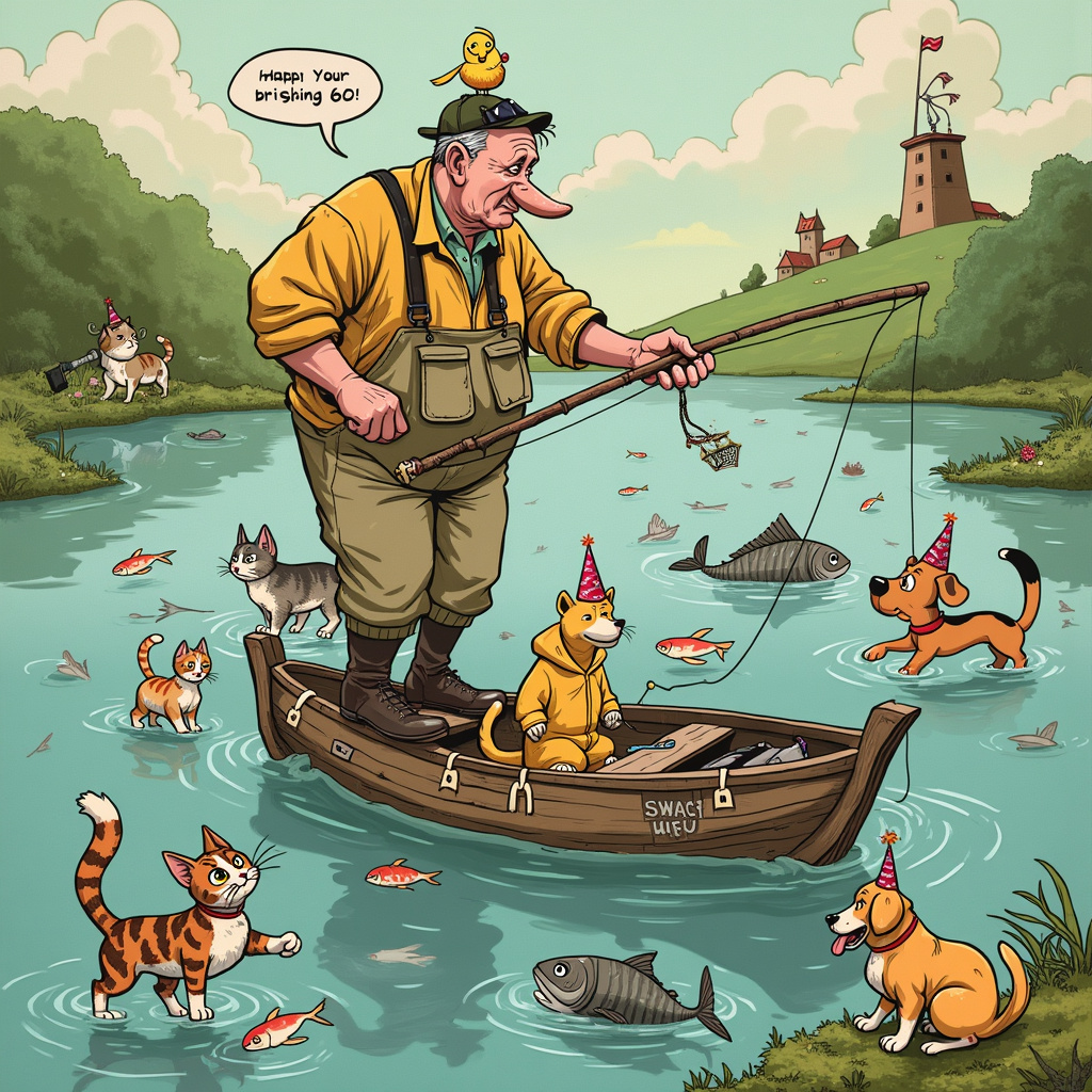 In his hands, he holds an over-sized fishing rod, the line of which plunges into a swirling lake that is teeming with activity. The lake is humorously populated with fish that seem to have cartoonishly human expressions – some smirking, some wide-eyed in panic, and one particularly plump fish proudly sporting a birthday hat with the number "60" emblazoned on it.