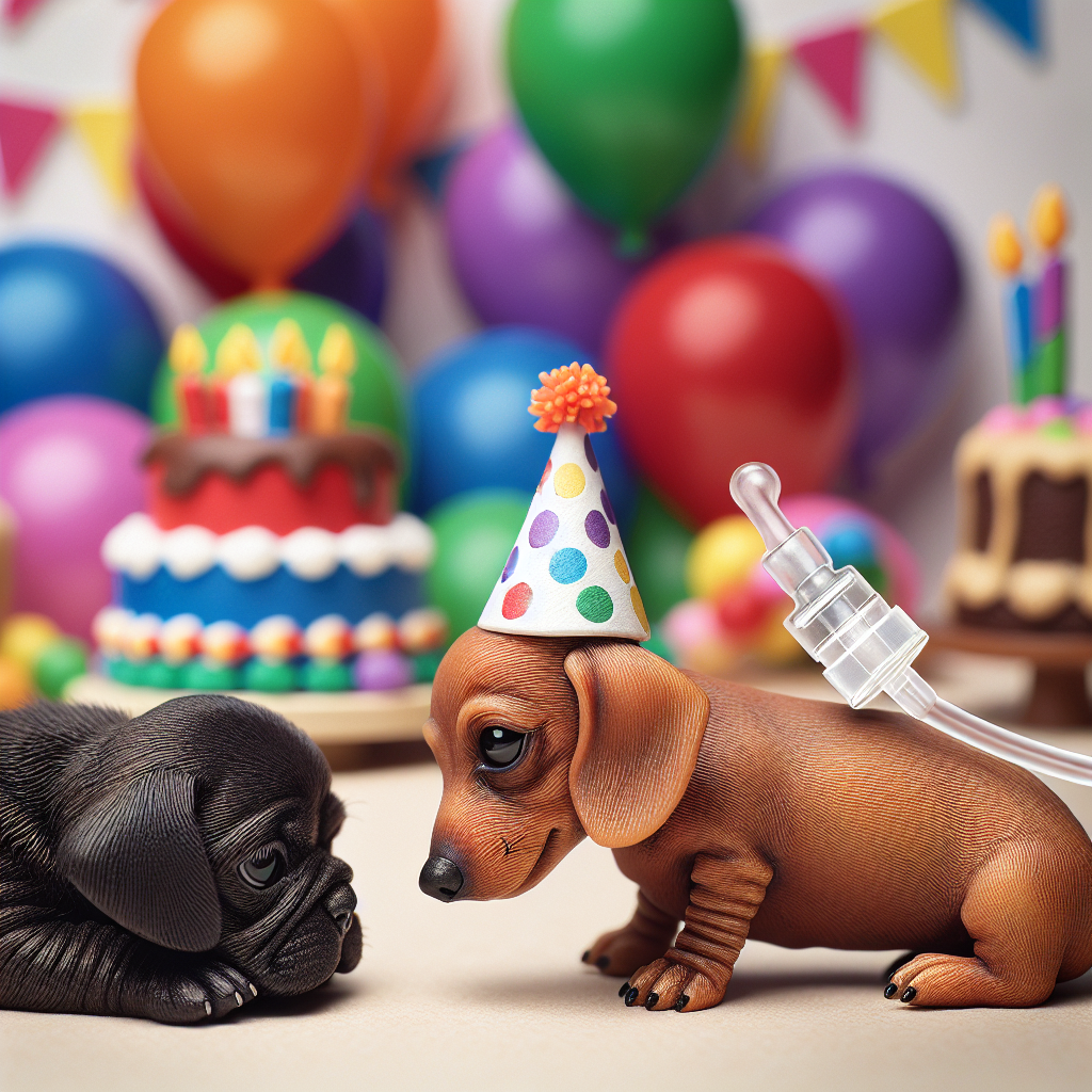 Imagine a birthday scene filled with vibrant decorations as a backdrop. Centered in this scene, a small brown Miniature Dachshund, donning a tiny colorful party hat, is interacting gently with a black Puggle. The detailing of the Dachshund is unique, as it is depicted with an NG (Nasogastric) tube subtly incorporated into its design, instilling an aspect of medical care for pets in a respectful manner, an aspect often unseen but present in the reality of pet health.