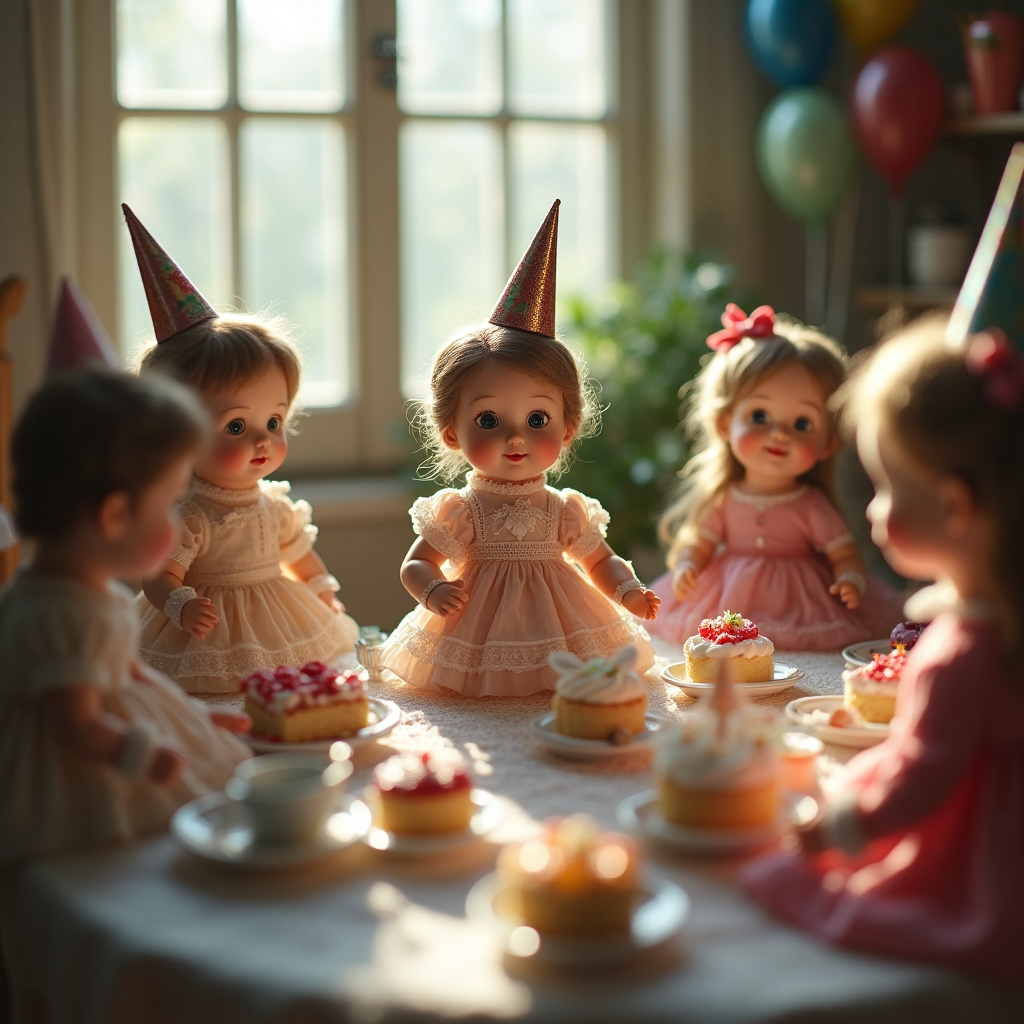 In the center, a petite antique doll with rosy cheeks and sparkling eyes sits poised with a tiny, intricate party hat perched on her head. Surrounding her, an assortment of miniature cakes and colorful balloons adds a splash of joy to the scene, while soft, natural lighting streams through a window, casting a warm glow and delicate shadows across the room.