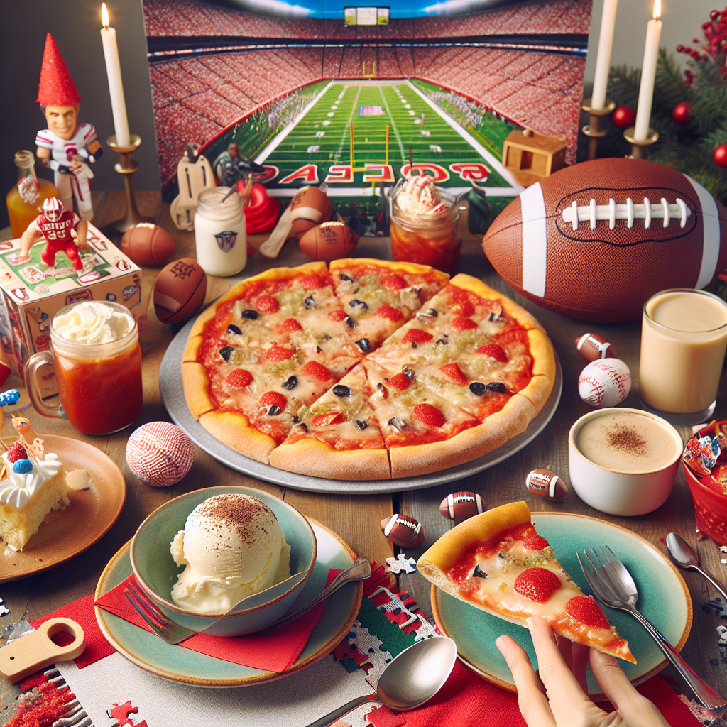 Picture a lively birthday celebration that pays attention to realistic detail. The decorations subtly incorporate the red and white colors associated with a popular football team, with miniature footballs sprinkled throughout the setting. At the center of attention, a homemade Margarita pizza appears incredibly genuine, with a slice already tempting the celebrants. Nearby, a half-finished jigsaw puzzle depicts a renowned football stadium, providing a peaceful pastime amidst the party. Homemade vanilla ice cream, peppered with real vanilla bean, is served next to freshly brewed coffee, blending sweet and bitter tastes in a symphony of flavors. The setting encapsulates the guest of honor's passions with delightful and believable detail.