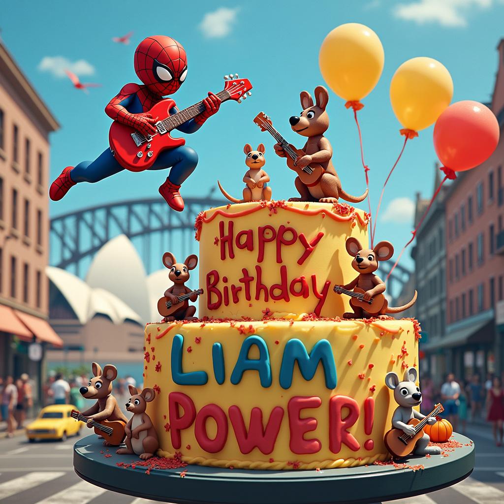 On the bustling streets of a vibrant cartoon Sydney, we find Spider-Man hanging from a web between the iconic Sydney Opera House and Harbour Bridge, plucking the strings of a bright red electric guitar. Balloons in the shape of kangaroos and koalas bounce in the air, beside a gargantuan birthday cake adorned with icing that spells out 'Happy Birthday Liam Power!' in a playful, comic-style font. The cake is extravagantly decorated with edible figurines of Australian wildlife, each playing a mini electric guitar. Atop the cake, a sugar-crafted Spider-Man is poised heroically, next to a fondant replica of Liam Power, both ready to save the day.
