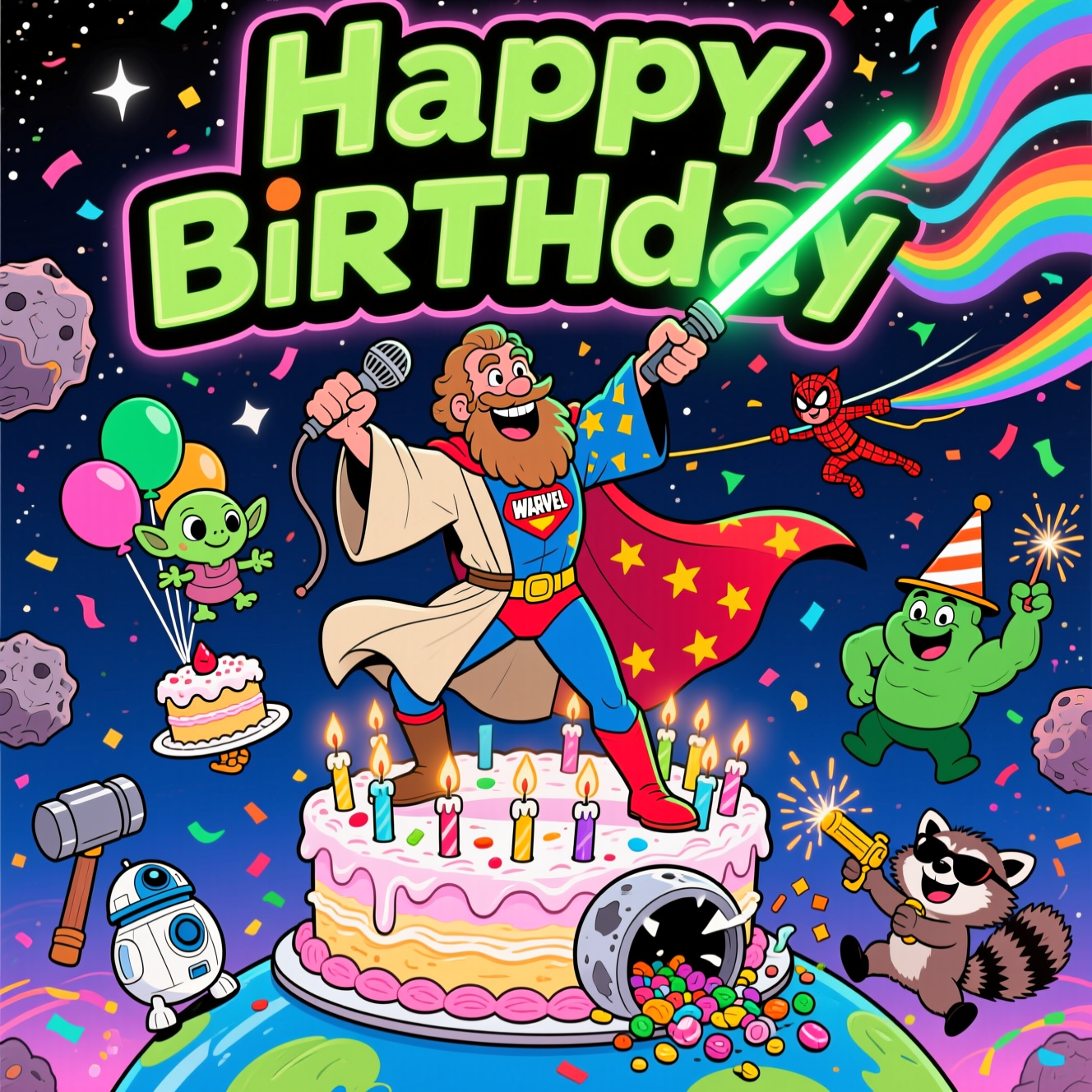 A big, playful Cartoon Style scene with bright saturated colors and exaggerated proportions: In the center, a joyful cartoon caricature of Brian Blessed (massive beard, booming grin, expressive eyebrows) strikes a heroic, wide-legged pose atop a frosted, planet-shaped birthday cake. He wears a cheeky mash-up outfit—one half flowing Jedi robe, the other half vibrant Marvel-esque superhero suit—plus a star-spangled cape billowing dramatically. He holds a glowing lightsaber–microphone aloft, projecting rippling, colorful sound waves that swirl confetti across a starry, cosmic party backdrop.
