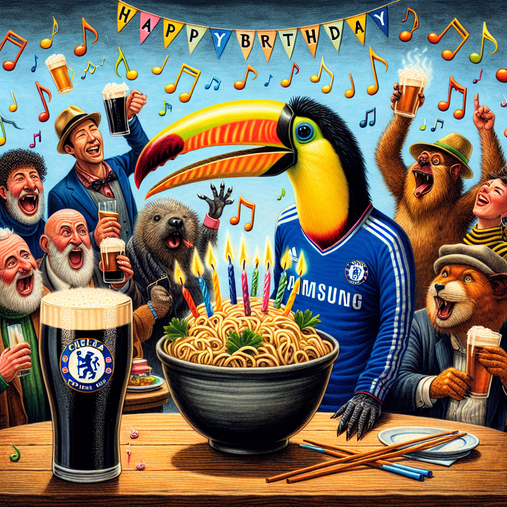 Create a vivid illustration of a humorous situation set in a lively birthday gathering. The center of attention is a vibrantly colored toucan, adorned in a Chelsea football jersey, comically attempting to blow out candles positioned atop a steaming bowl of ramen in lieu of a conventional birthday cake. Musical notes symbolizing a lively party atmosphere sprinkle the backdrop, setting the scene of an animated get-together. A diverse group of party guests, comprising variously descended men and women and an assortment of friendly animals, respond with jubilant cheers, each raising a pint of a dark, frothy Irish stout. The blending of elements, including football memorabilia and an Irish pub ambiance, brings a unique twist to the festive occasion.