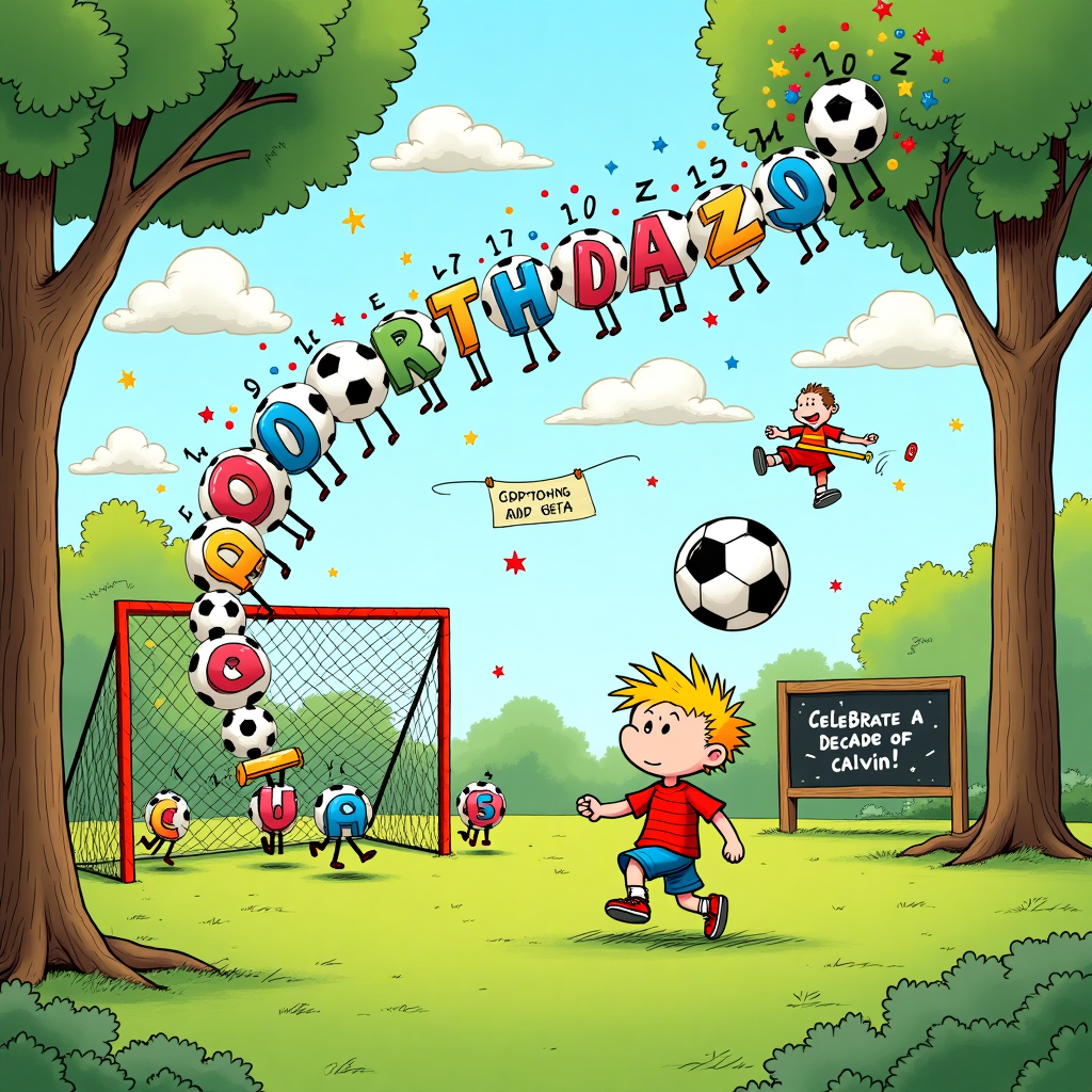 Around Calvin, his friends, each with distinctive, quirky attributes inspired by R. Crumb's eccentric characters, cheer and point at the sky where the ball traverses. One friend holds a math textbook as if coaching the ball through the numerical cloudscape, while another juggles calculators as if they were part of the soccer match. Above this dynamic scene, the sky is filled with fluffy clouds shaped like algebraic expressions. A banner strung between two trees reads, "Celebrate a Decade of Calvin!" with each letter formed by soccer balls that have grown playful cartoon legs and arms, adding a touch of Hergé's playful, Tintin-esque action. Nearby, a tree trunk doubles as a blackboard, chalked with birthday wishes and confetti-filled numbers.