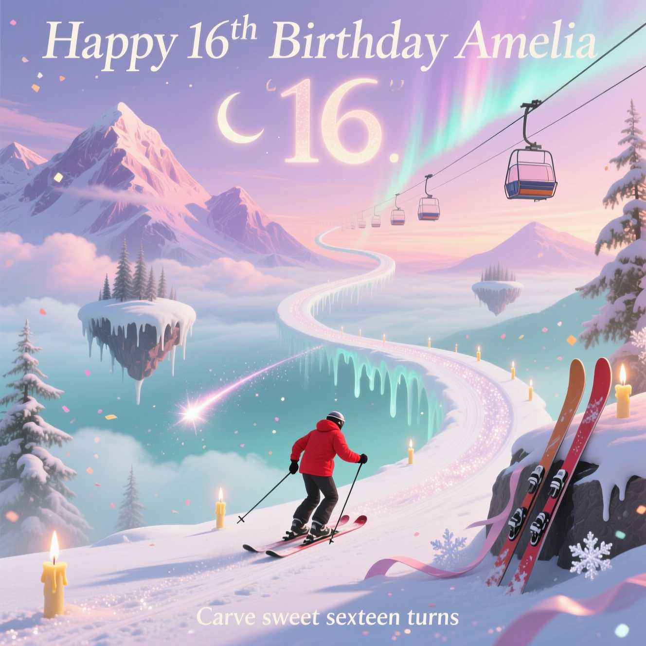 Render the headline as delicate ski-tracks etched across a soft snow-cloud horizon, lightly sparkling with frost for legibility. Portrait orientation. A dreamlike, Dali-inspired alpine wonderland at peach–lavender dawn: towering peaks drift like floating islands, and a sinuous, melting ski slope unfurls into the sky, looping to form a graceful, luminous “16.” A lone skier in a bright red jacket carves serene, glowing turns along the loop, their trail glittering like comet dust. Ski poles subtly morph into birthday candles whose tiny golden flames unravel into aurora ribbons. Chairlifts hang like crescent moons on thread-thin cables; pines bend gently as if made of soft wax; a pair of skis drape over a rock like melting ribbons. Snow crystals shimmer in the air like confetti; long, silky shadows and ethereal rim light create a calm, sincere, hopeful mood. Palette of icy teal, pearly white, blush peach, and amethyst; painterly texture, soft haze, high detail, dreamlike surrealism with melting forms and impossible perspectives, large clean sky for breathing space.