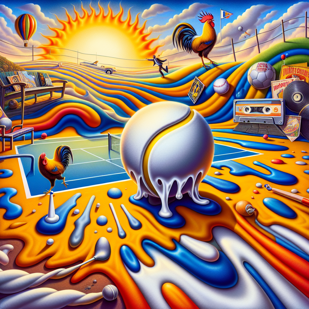 Depict a Surreal Abstract scene symbolizing a birthday celebration. The major element of the scene is a radiant, melting tennis court that ambiguously blends into the surrounding landscape in a way reminiscent of Salvador Dali's work. A white sphere, like a tennis ball in appearance, floats serenely in the middle of the air. There are colorful spur-like shapes in the scene which pay appreciative tribute to a sports team; the patches of color mimic a rooster emblem prancing on wavy grass. An ambiguous character with a vibrant lightning bolt marking is seen walking across a patchwork surface of various record album covers and items evoking the 1980s. The scene intertwines elements of the past with elements characteristic of a dream-like present.
