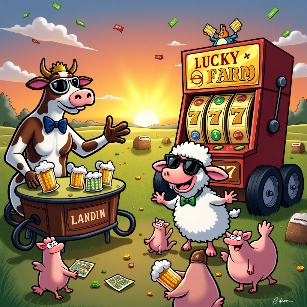 In a vibrant, humorous cartoon style, depict a wild farmyard casino scene at sunset. A cow wearing a dealer’s visor and bowtie operates a giant golden slot machine labeled “LUCKY FARM 19.” Chickens peck at oversized scratch tickets, pigs cheer wildly at a beer pong table (replacing traditional pong balls with mini lotto balls), and a tractor doubles as a rolling bar serving frothy pints of beer. Landin, illustrated as a goofy-looking sheep in sunglasses, pulls the slot handle with dramatic flair — symbols spinning include beer mugs, golden corn, four-leaf clovers, and jackpot sevens made of hay. Scattered hay bales in the background have “Birthday Bets Pay Off Big!” painted on them. Add tiny lotto scratch cards fluttering from the sky like confetti. Overall tone: cheeky, fun, chaotic farmyard celebration meets casino party.