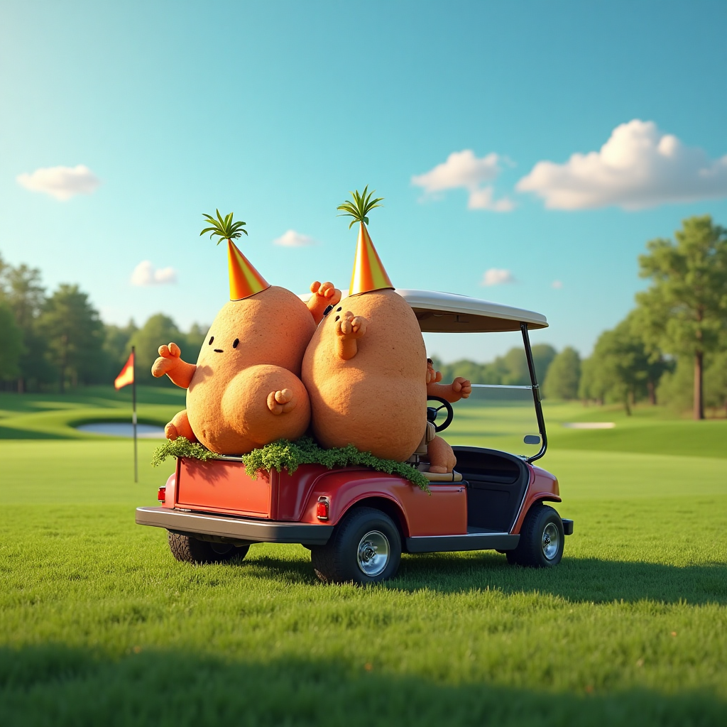Picture a lush, perfectly manicured golf course under a clear blue sky, capturing the serene beauty of the sport. In the foreground, a golf cart is parked on the green, humorously overflowing with giant, realistically rendered sweet potatoes wearing tiny birthday hats. One of the sweet potatoes is comically positioned in the driver's seat, gripping the steering wheel with leafy sprouts. In the background, a flag flutters gently in the breeze near the hole. The scene is bathed in the golden glow of the sun, with shadows and highlights bringing the textures of the sweet potatoes and the vibrant green of the golf course to life.
