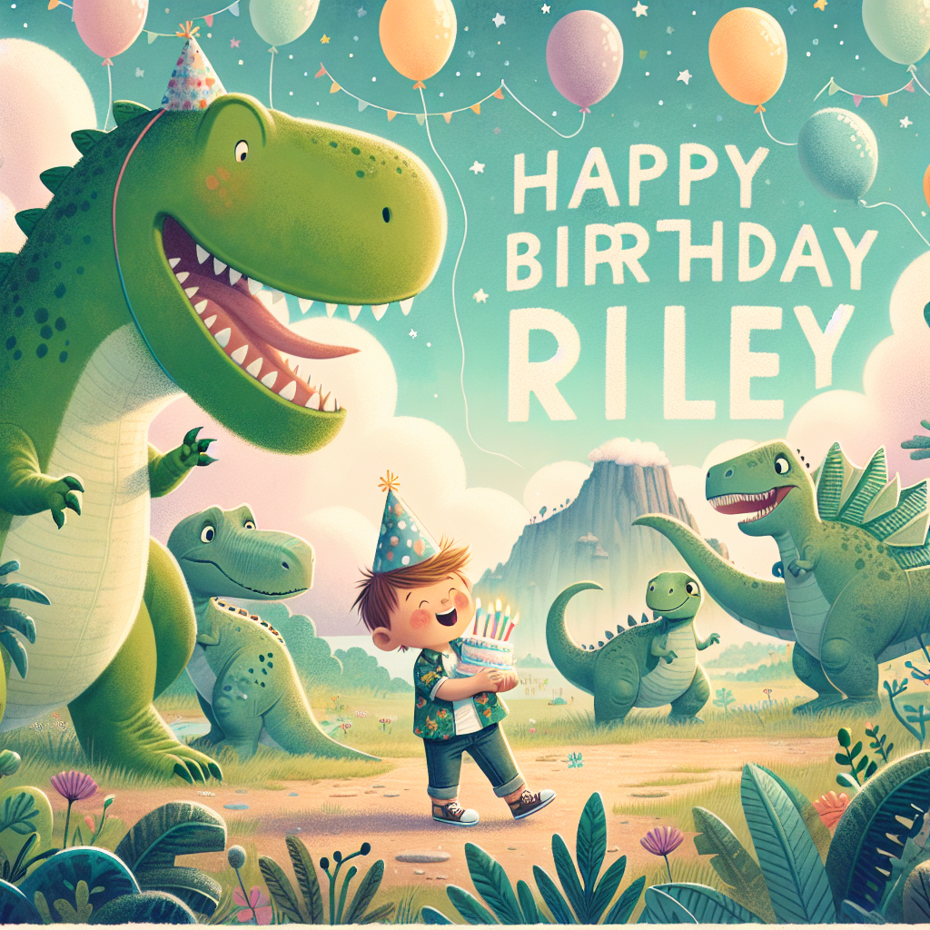 A heartwarming birthday scene captures the adventures of a 6-year-old child named Riley, clad in a playful dinosaur costume wearing a birthday crown. The landscape teems with friendly, cartoon-styled dinosaurs. In an affectionate moment, Riley is seen sharing a warm hug with a large, gleeful dinosaur. The sky overhead is dotted with floating balloons, while fluffy clouds form a gigantic 'Happy Birthday Riley!' message. The entire frame is punctuated with a soft and inviting color scheme, predominantly featuring pastel hues, effectively adding a whimsical touch that signals an endearing celebration.