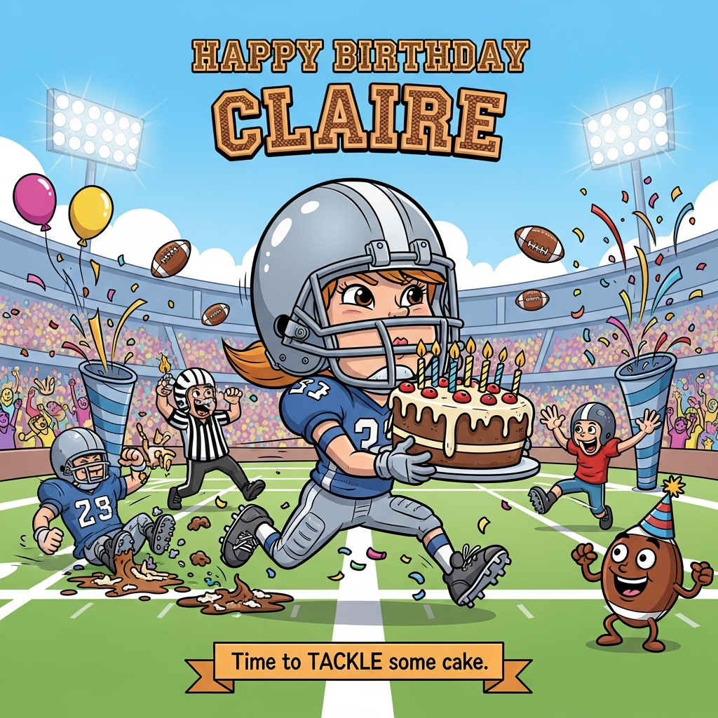 Full-bleed, portrait, funny cartoon scene on a sunny American football field. Center stage: a bouncy, big-headed running back dashing toward the end zone, cradling an oversized football-shaped birthday cake like the game ball—candles wobbling, icing stripes mimicking yard lines. She wears a comically huge shiny helmet and chunky pads, tiny legs pumping, cleats kicking up confetti. Thick black outlines, bright saturated colors, and exaggerated squash-and-stretch poses.