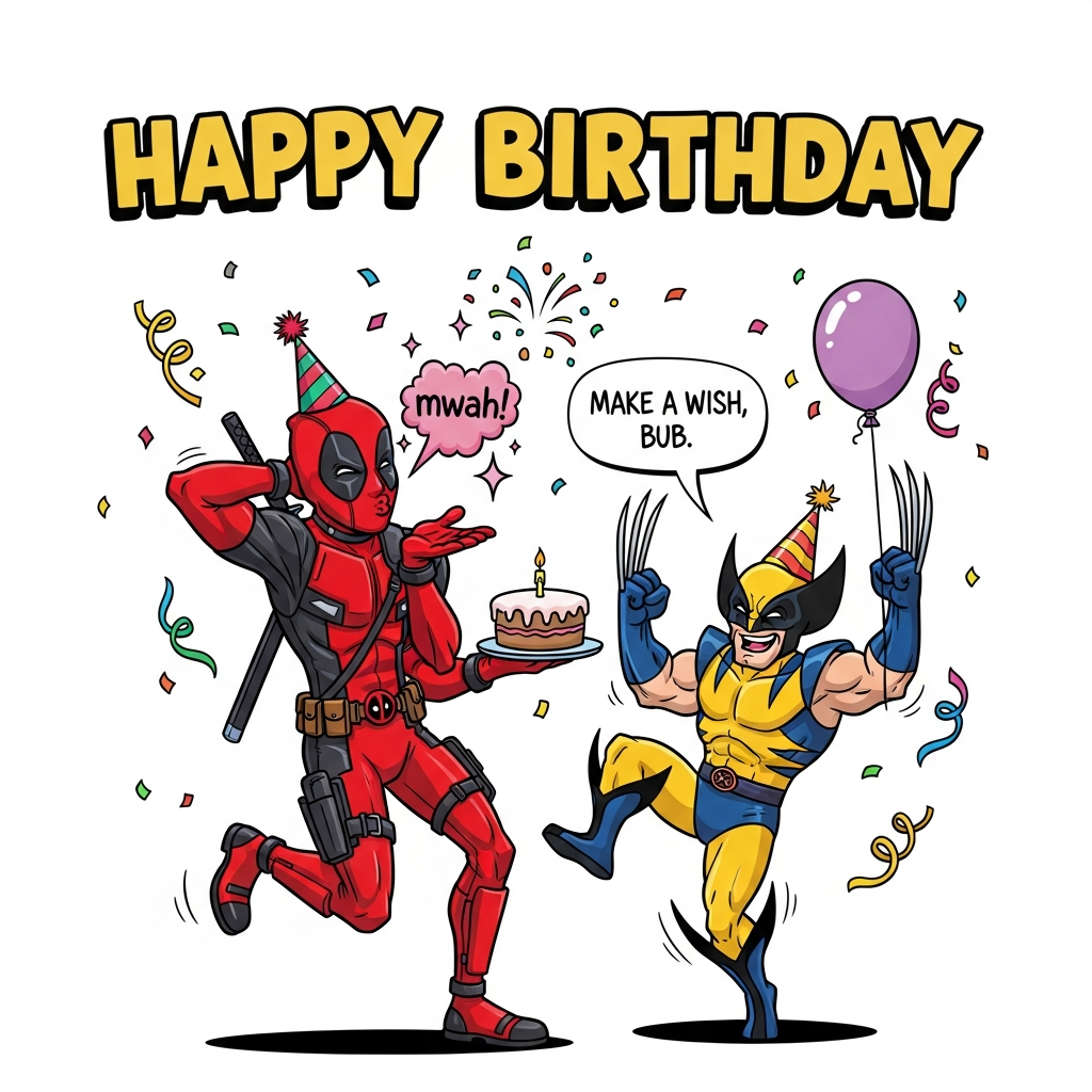 Clean white background; playful, funny party vibe; thick black outlines; bright saturated colors; portrait composition. Deadpool on the left in his red-and-black suit with exaggerated proportions, striking a cheeky, sexy pin-up pose—one knee bent and hip popped, one hand behind his head, the other blowing a kiss straight at the viewer; flirty wink; a pink heart-shaped “mwah” puff with sparkles. To Deadpool’s right (image right), Wolverine in his classic yellow-and-blue suit dancing joyfully, claws retracted, one foot kicked out, big grin, a shiny helium balloon in his raised hand; both wearing tilted party hats. Confetti bursts and curly streamers swirling in the air; a small frosted birthday cake with a single candle between them. Add one short gag line as a speech bubble from Wolverine: Make a wish, bub!