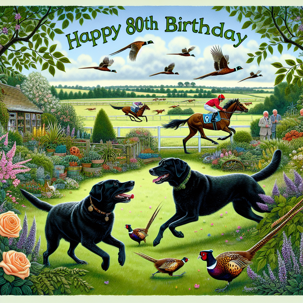 This delightful illustration commemorates an 80th birthday with a vibrant depiction of country life. The spotlight is aimed at two euphoric black Labradors, scrambling through a verdant garden filled with botanical marvels. An exciting horse race happens in the distance, set against the serene backdrop of rural scenery. Pheasants stealthily scatter across the view, adding a touch of wild allure. The scene is lovingly framed by the tender message, 'Happy 80th Birthday', making it a fitting tribute to this important life event.