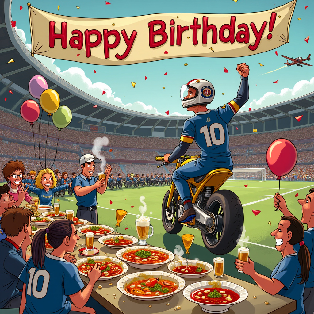 Imagine a bustling, cartoonish birthday scene set in a whimsical stadium that merges the worlds of Southend United football, Speedway racing, curry feasting, and cider sipping, all in one vibrant tableau.