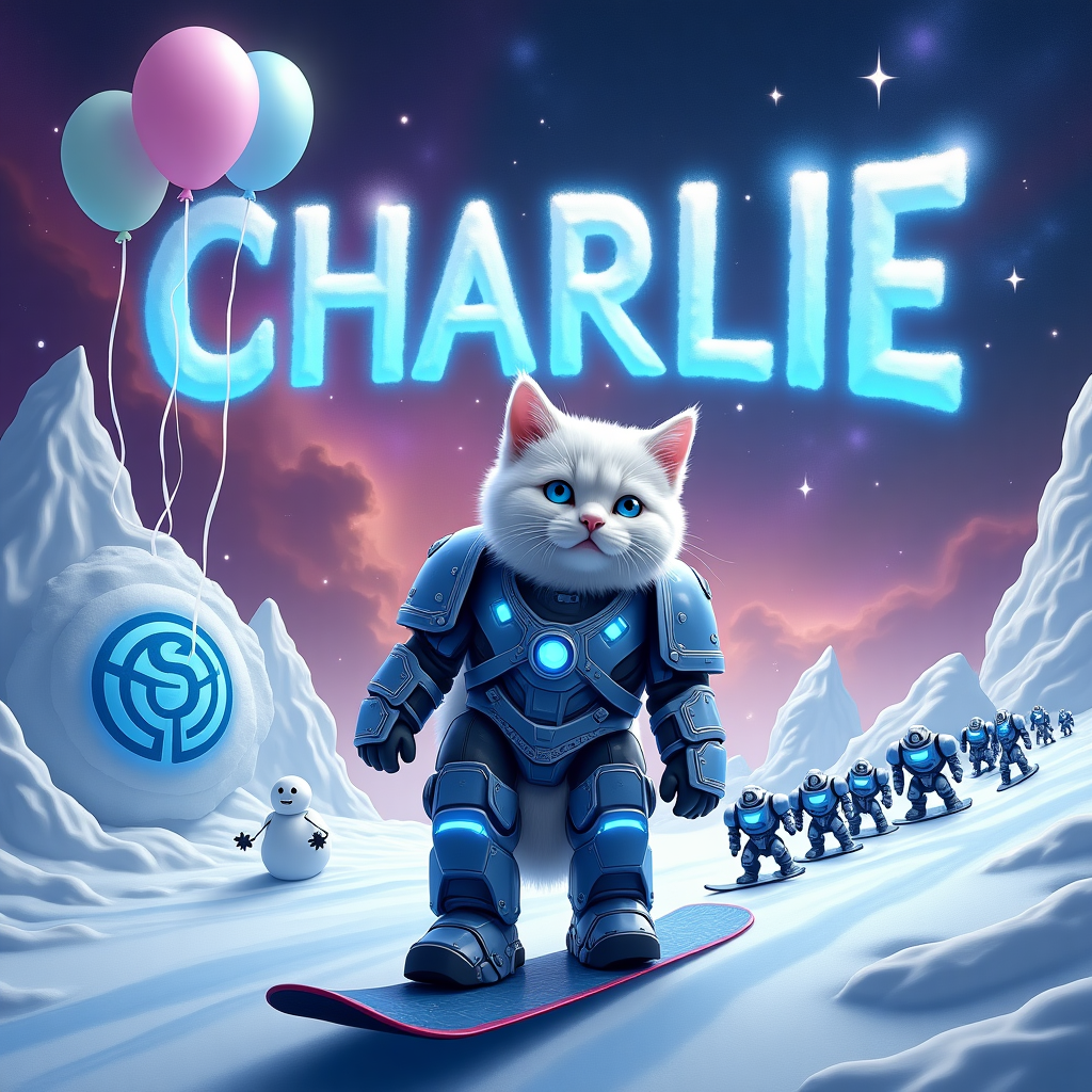 This intricate blend of elements creates a unique narrative, celebrating Charlie's birthday in a way that combines the thrilling excitement of snowboarding with the strategic depth of Warhammer Tau Empire, all while being accompanied by a charming Ragdoll cat.