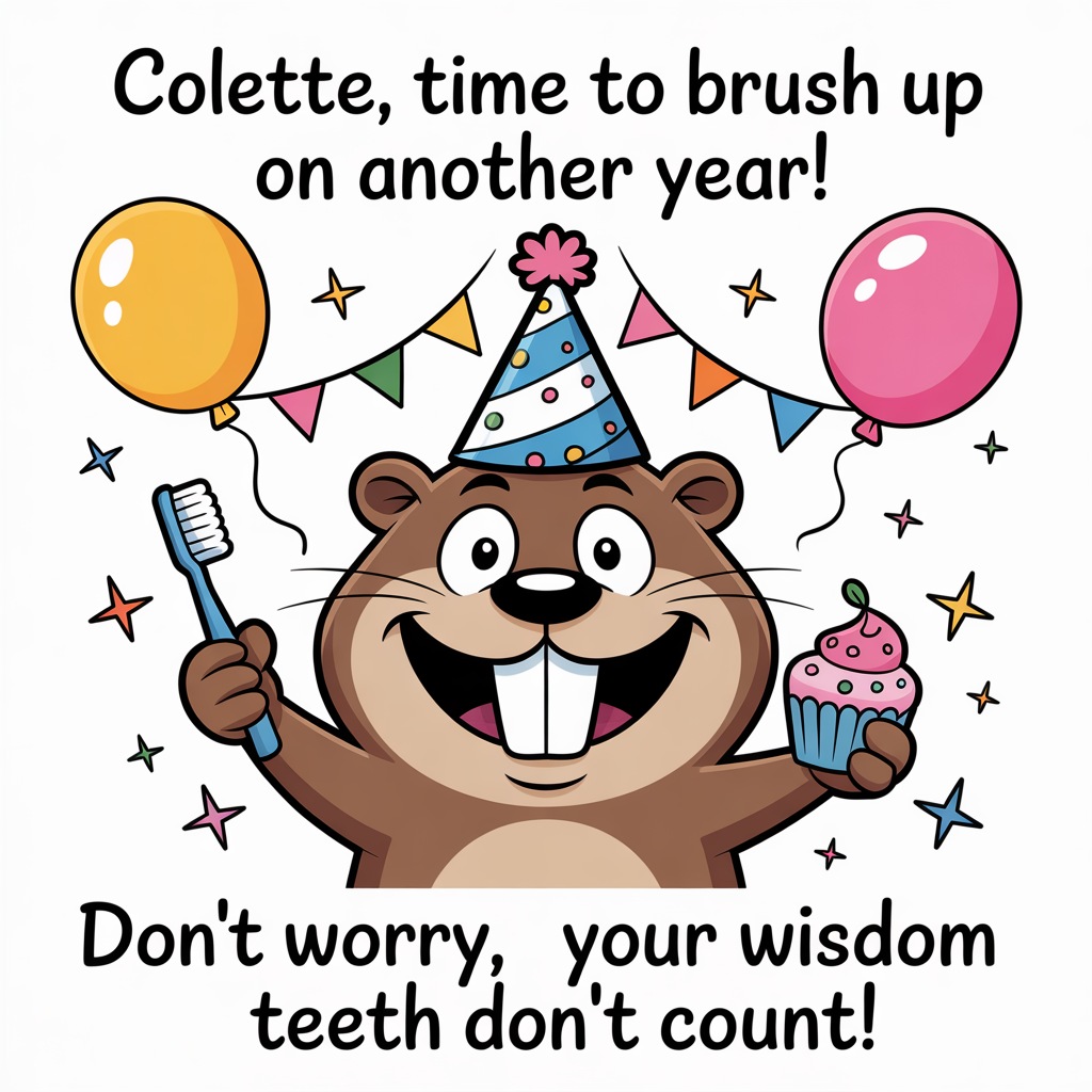 At the top of the image, "Colette, Time to Brush Up on Another Year!"